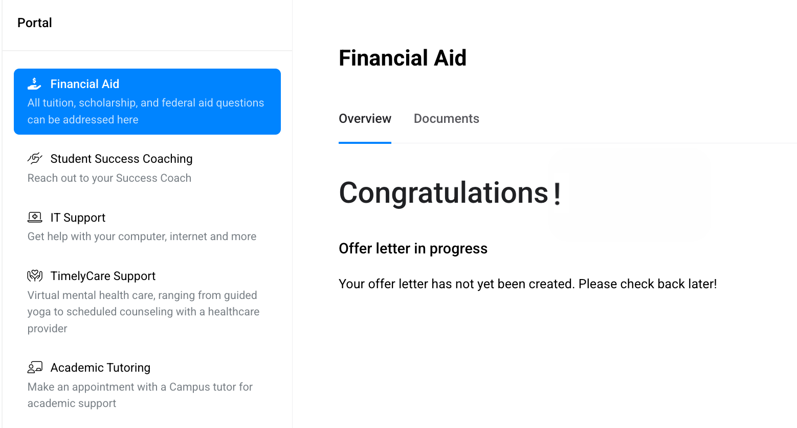 The first section gives you an overview of your financial aid, along with your FAID documents.
