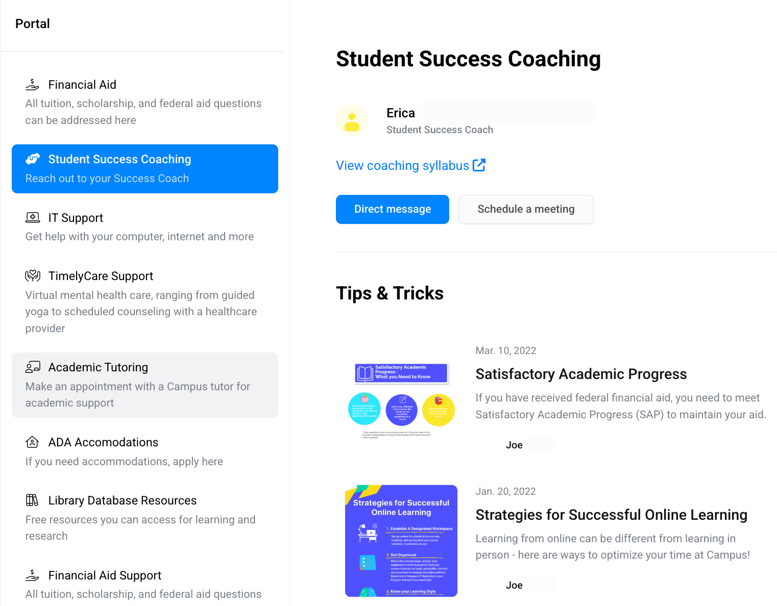Here you can message or schedule time with your Student Success Coach, and explore tips to support your academic progress.