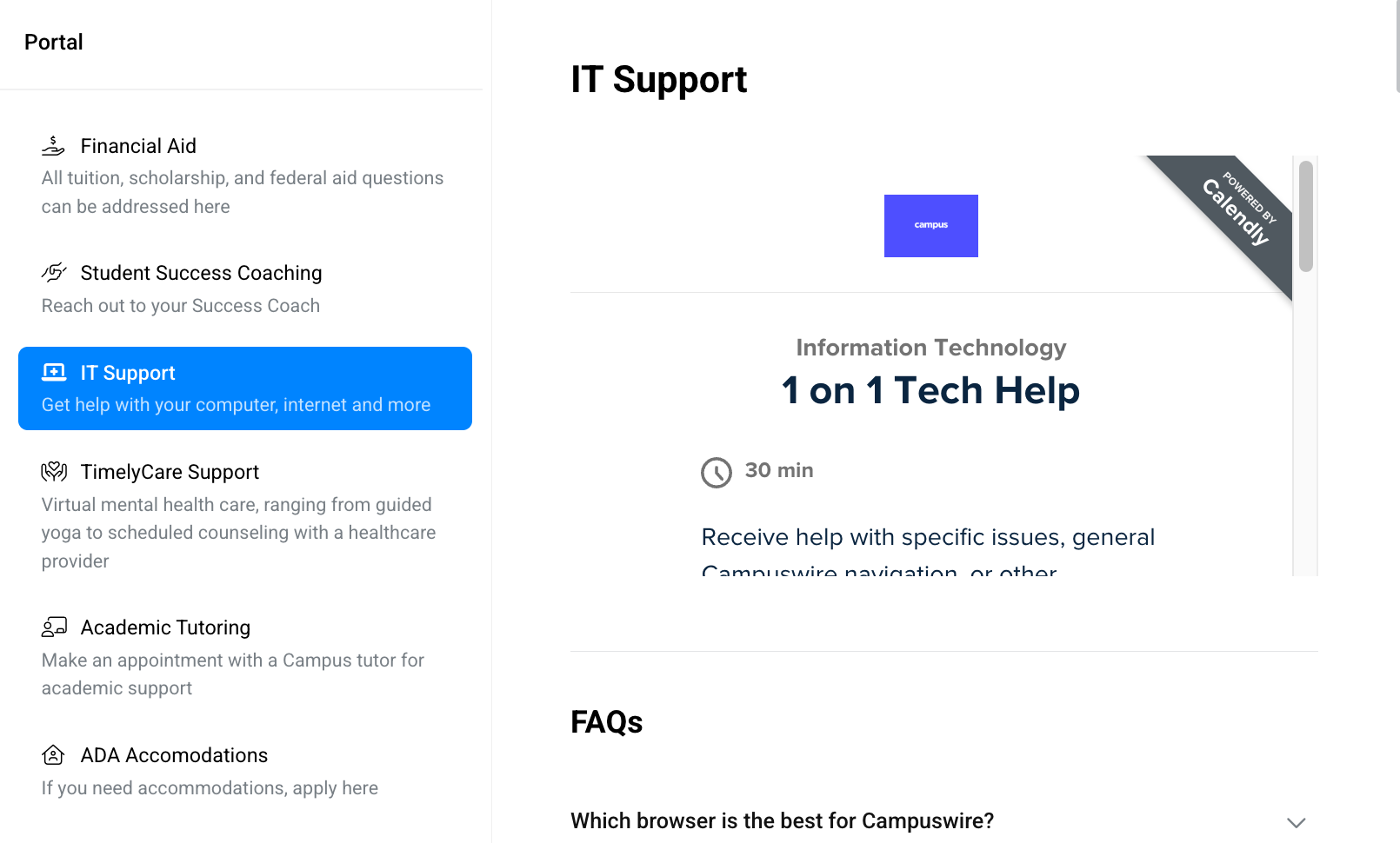 Use this area to book a one-on-one session with an IT Specialist or browse the FAQ for quick answers.