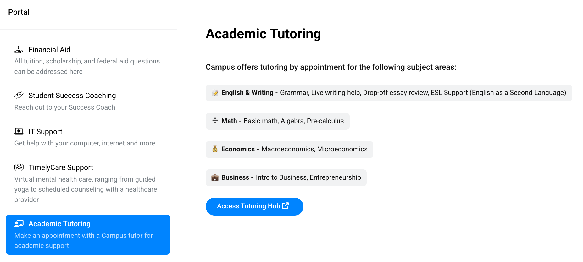 The student portal provides access to important resources you’ll use throughout your program. Here you’ll find financial aid information, ways to connect with your Student Success Coach or IT Support, tutoring, health services, and more.