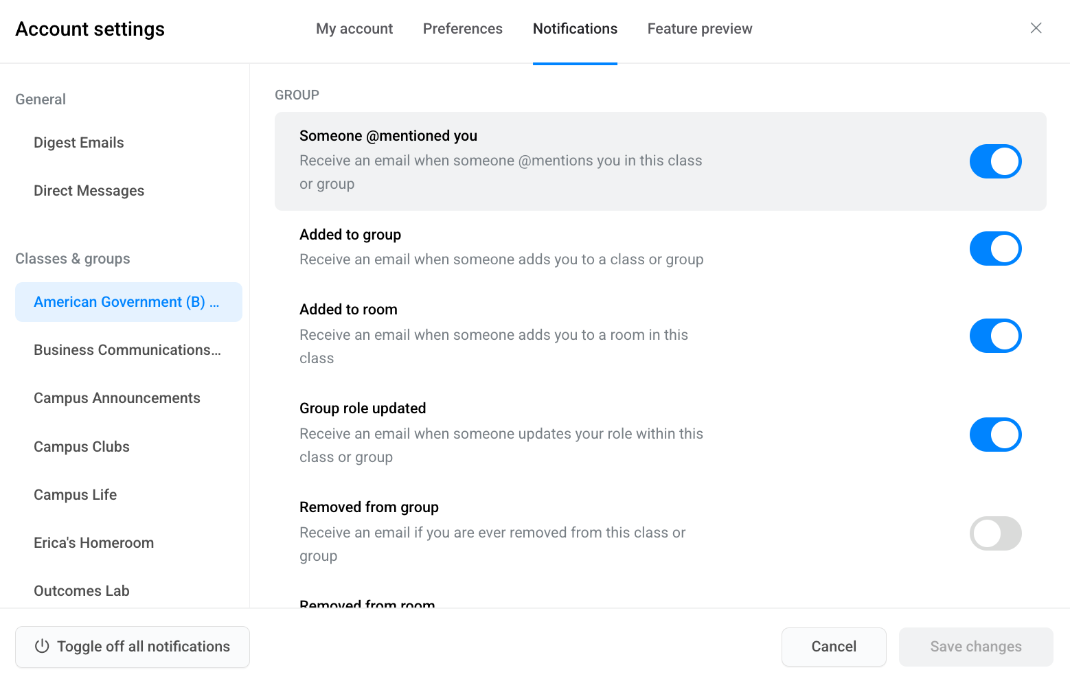The Feature Preview section lets you try new features. For example, you can toggle Group Navigation, which changes how your class navigation menu looks.