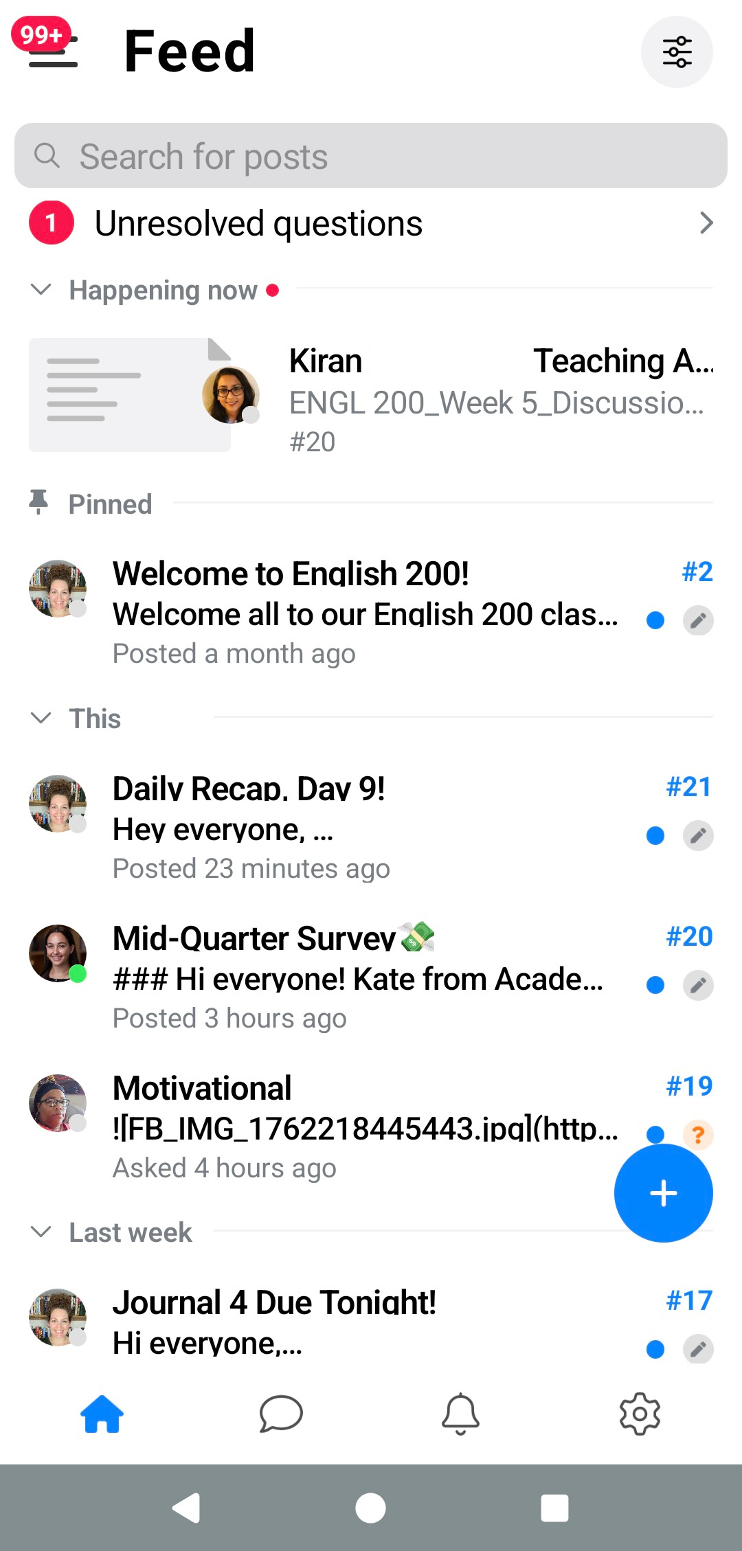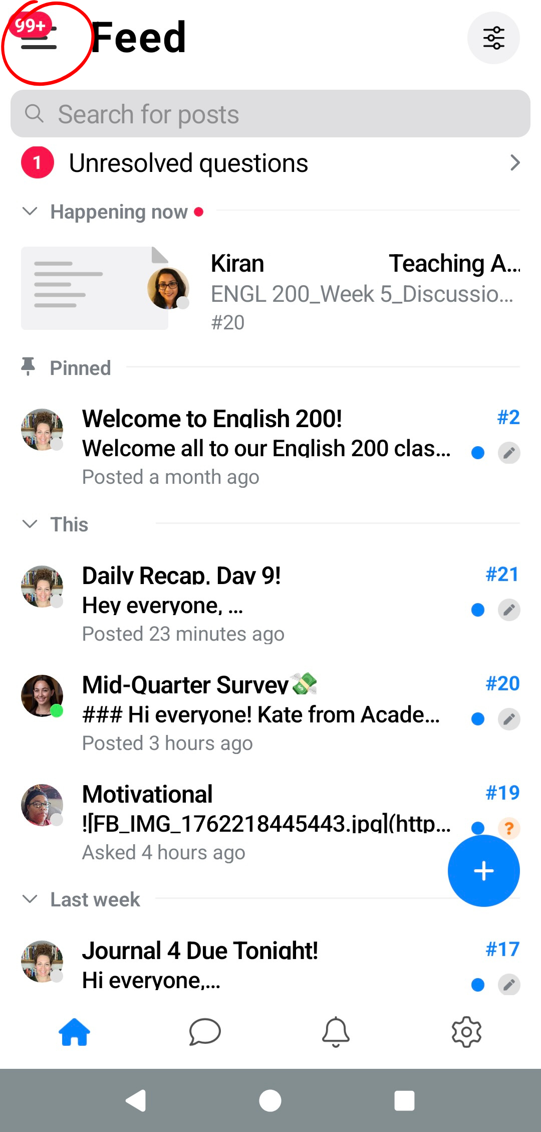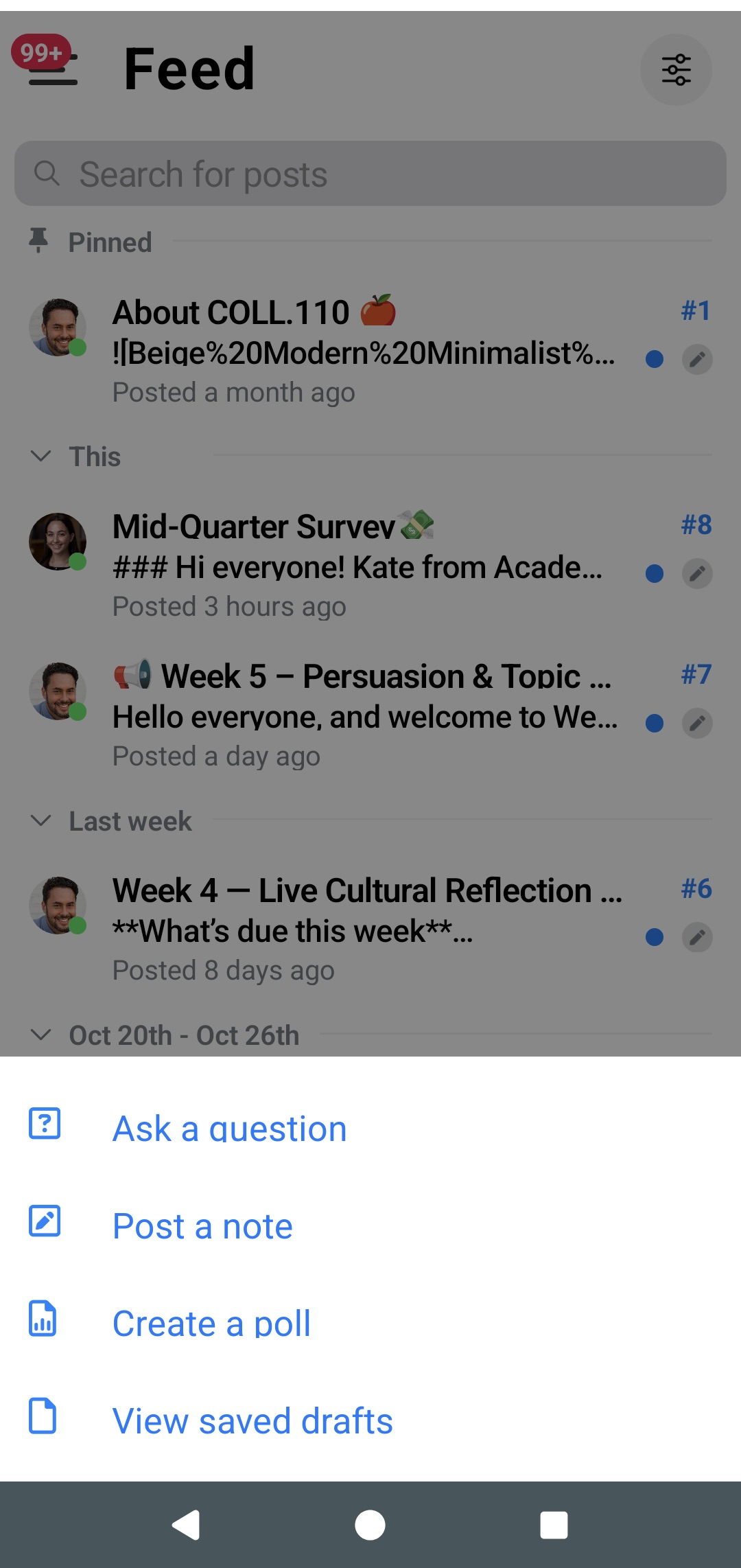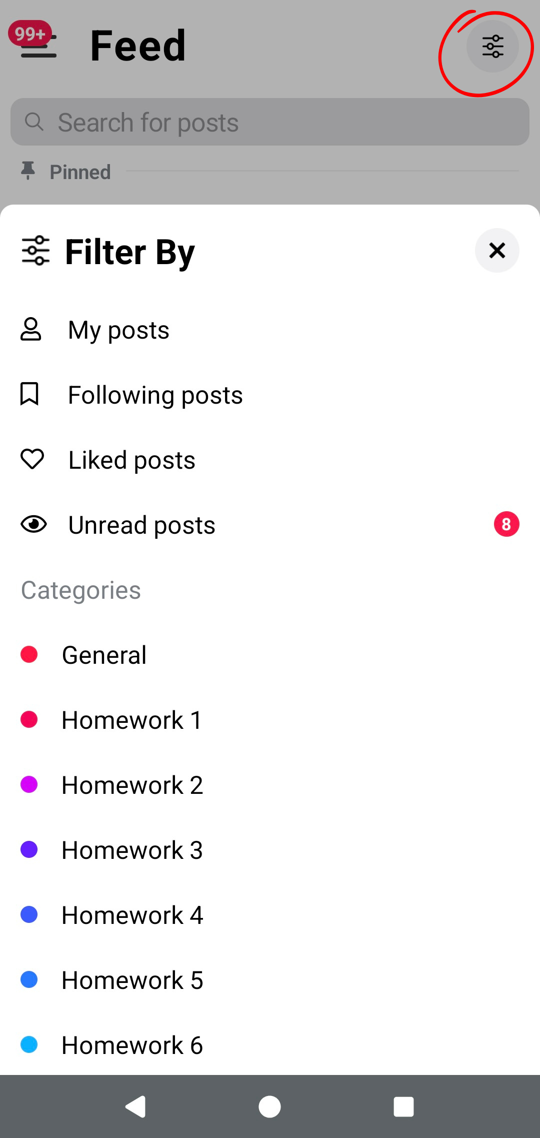 Here is where you can sort through your class feed to locate specific post categories and types, including Unread posts, Liked posts, Homework posts, etc.