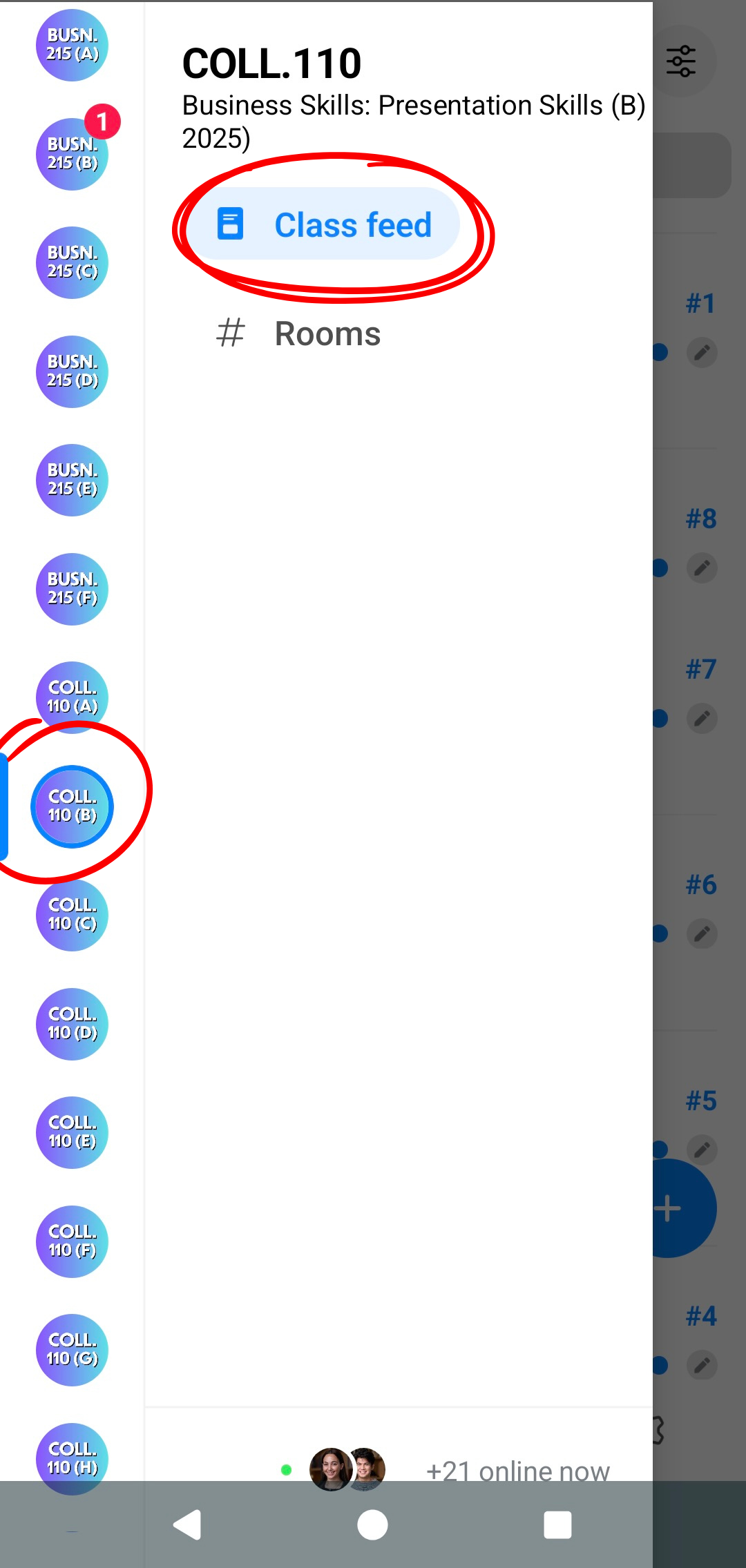 The mobile app home page will default to the feed of the currently selected class.
